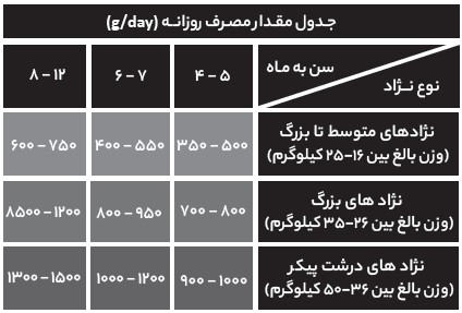 روش استفاده : مقدار غذای روزانه برحسب سن و وزن توله سگ در جدول توضیحات مشخص شده که می بایست این مقدار غذا را حداقل طی دو وعده (یا بیشتر) در اختیار سگ قرار داد. توجه داشته باشید که تغییر ناگهانی غذا باعث ایجاد مشکلات گوارشی می شود به همین دلیل باید مقدار کمی غذای جدید را به مرور با غذای قبلی مخلوط کرده تا در مدت زمان 6 تا 7 روز سگ شما به غذای جدید عادت کند . لطفا همواره آب آشامیدنی تازه در اختیار حیوان قرار دهید.