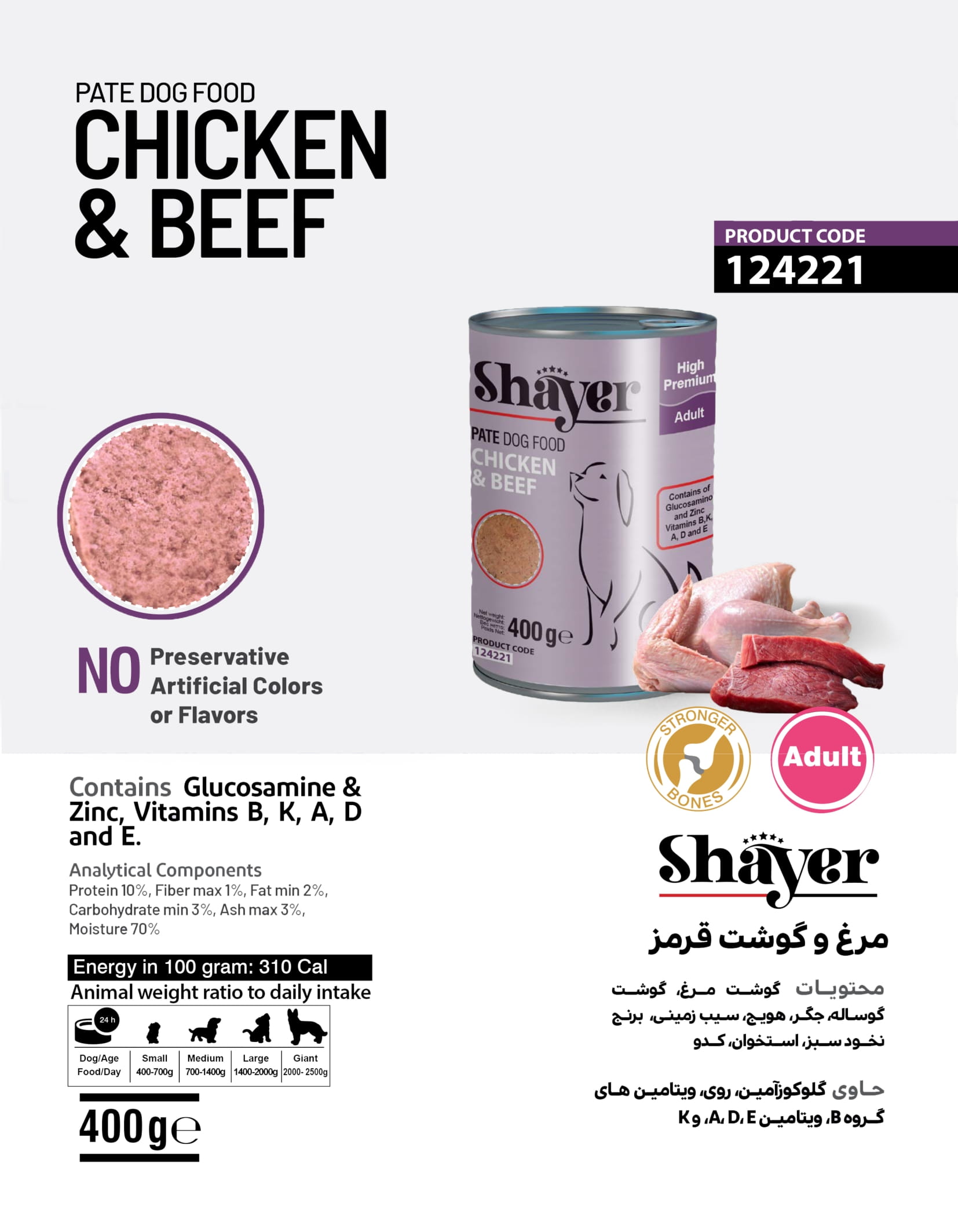 کنسرو سگ شایر مرغ و گوشت قرمز ۴۰۰ گرمی Shayer با توجه به داشتن پروتئین و فیبر لازم و مواد مغذی کاملا طبیعی برای تمامی سنین مناسب است. از افزودنیهای شیمیایی، مواد نگهدارنده، طعم دهندهها و رنگ دهندههای مصنوعی و پروتئینهای گیاهی و فیلرها استفاده نشده است. این کنسرو فاقد شکر، نمک و گلوتن میباشد و در آن از پر کننده (Filler) استفاده نشده است. به دلیل وجود افزودنیهای طبیعی ( گلوکوزامین و زینک ) باعث استحکام استخوان در تمامی سنین میشود و با توجه به داشتن امگا ۳ و ۶ به نگهداری و سلامت پوست و مو و همچنین رشد مو کمک قابل توجهی مینماید.